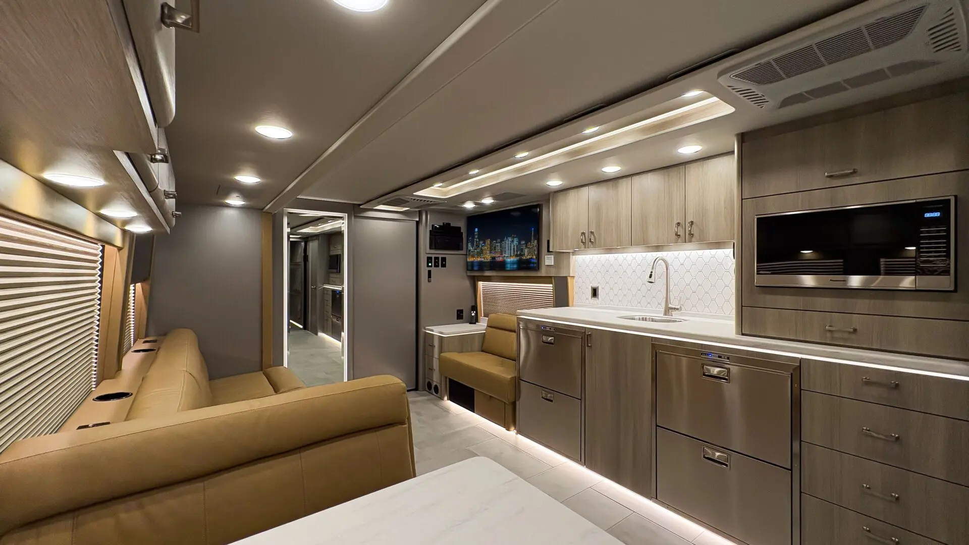 The lounge offers premium seating with ambient LED lighting, surround sound, and a full-service bar. A dining area, guest bathroom, and flexible layouts make it ideal for entertaining or relaxing.